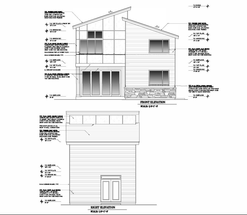 - Exterior Elevations: A blueprint picture of all four sides showing exterior materials and measurements.