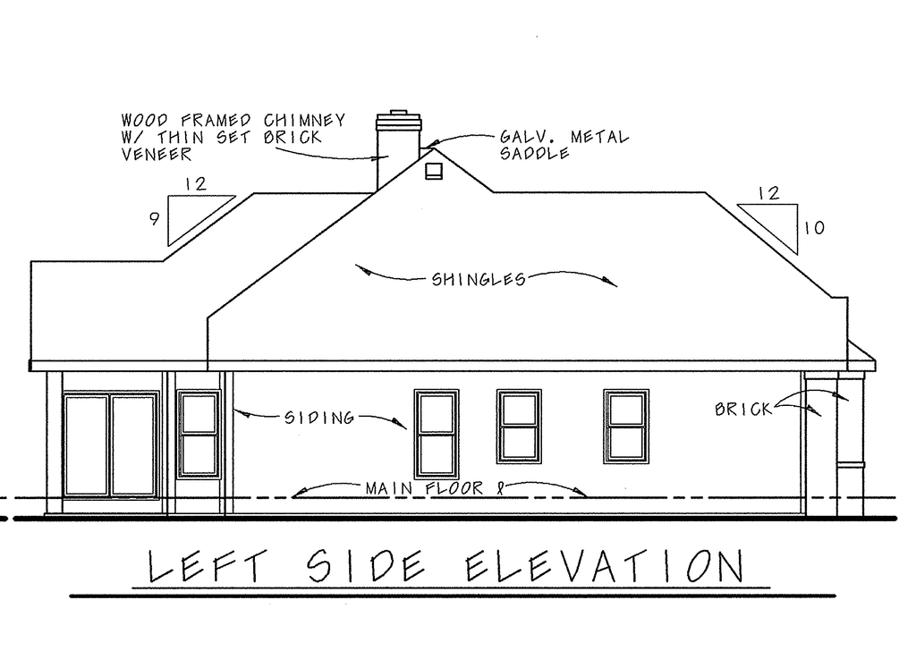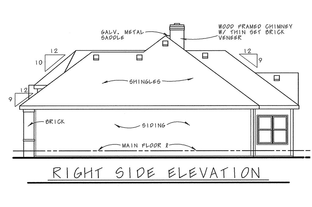- Exterior Elevations: Drafted at 1/4" scale for the front and 1/8" scale for the rear and sides. All elevations are noted and an aerial view of the roof is provided, showing all hips, valleys and ridges.