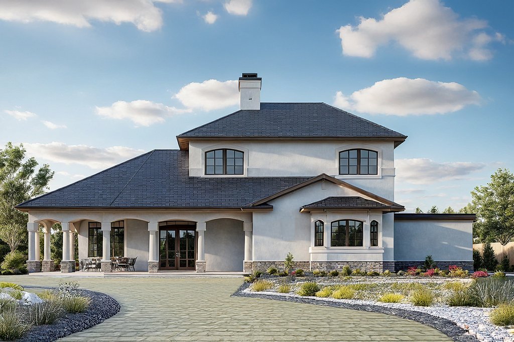 - Elevations: Shows the front, sides, and rear, including exterior materials, trim sizes, roof pitches, etc.