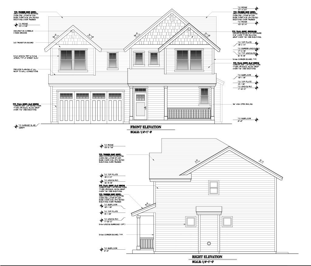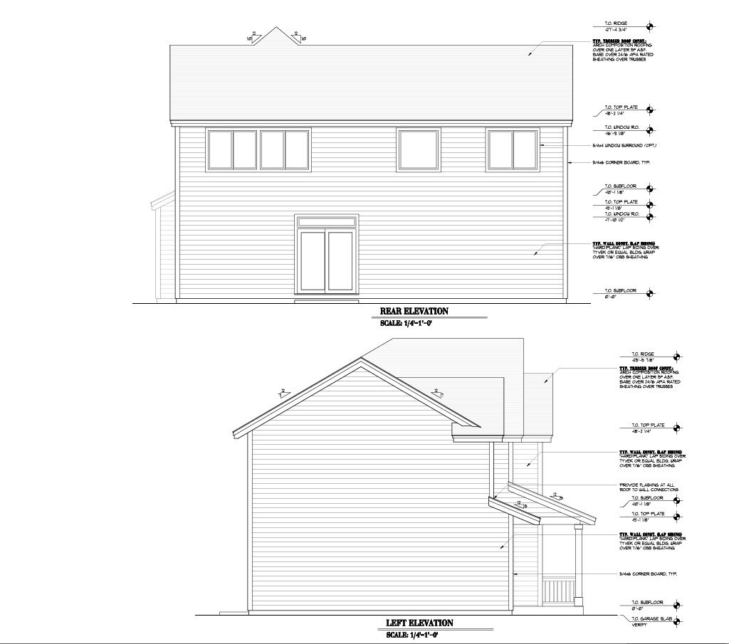 - Exterior Elevations: A blueprint picture of all four sides showing exterior materials and measurements.
