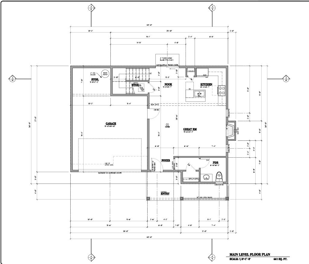 - Foundation Plan: Drawn to 1/4" scale, this page shows all necessary notations and dimensions including support columns, walls and excavated and unexcavated areas.