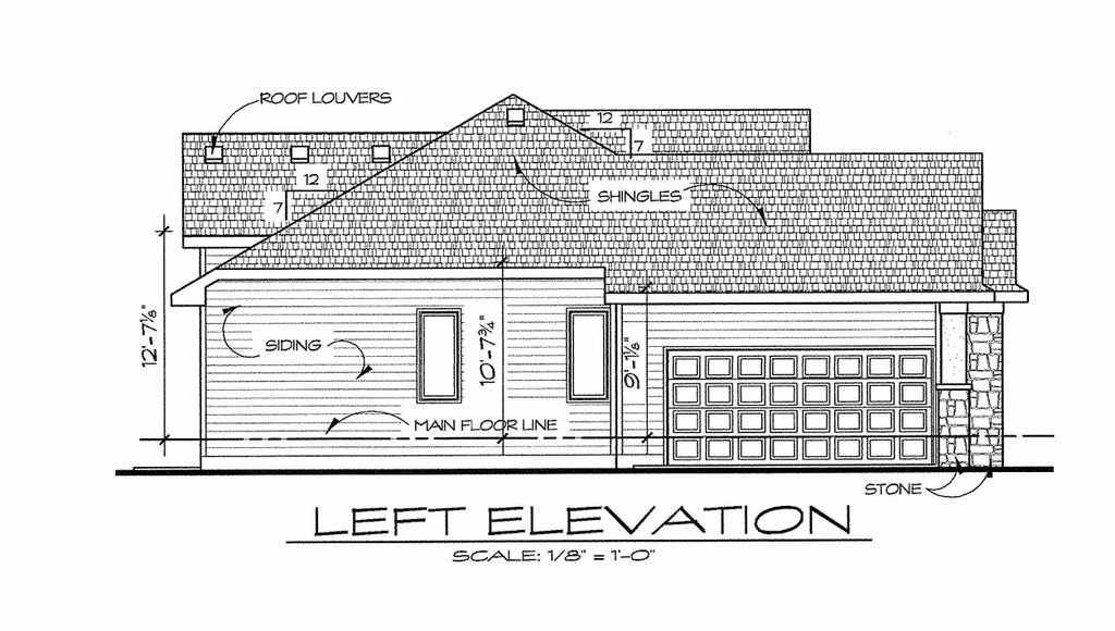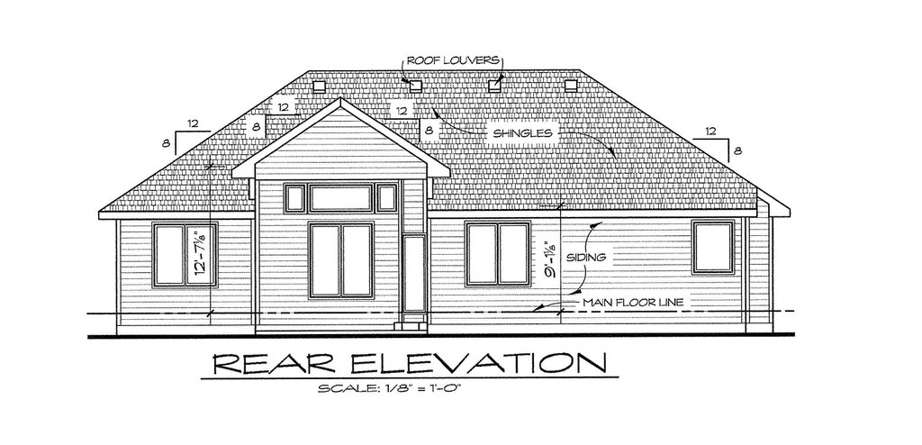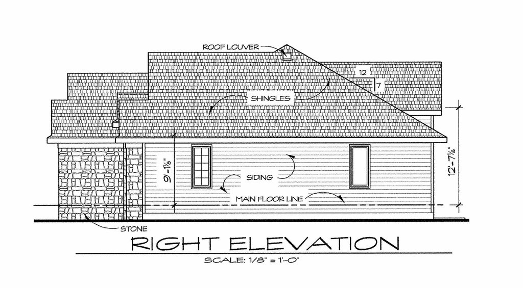 - Exterior Elevations: Drafted at 1/4" scale for the front and 1/8" scale for the rear and sides. All elevations are noted and an aerial view of the roof is provided, showing all hips, valleys and ridges.