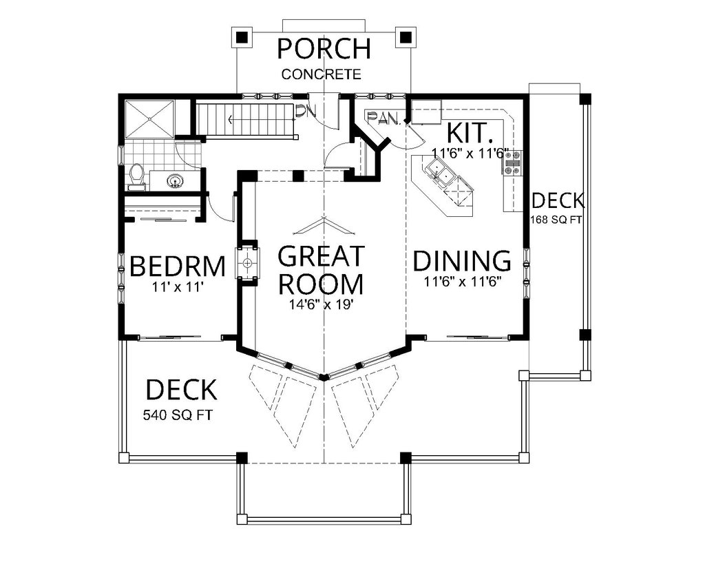 Ceiling Details : Ceiling Heights: Main Floor: 9’-0” Basement: 8’-0” Great Room & Dining: 9’-0” at wall sloping to 13’-8” at interior ridge.