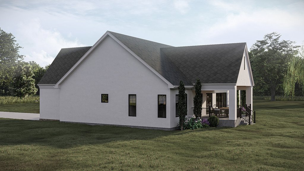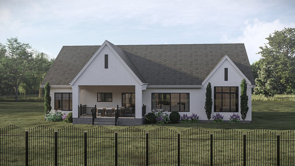 Ceiling Details : The great room, dining, and kitchen all have a cathedral ceiling. The master bedroom has a cathedral ceiling. The rear covered porch has a cathedral ceiling. The front covered porch has an 11'-0" high ceiling.