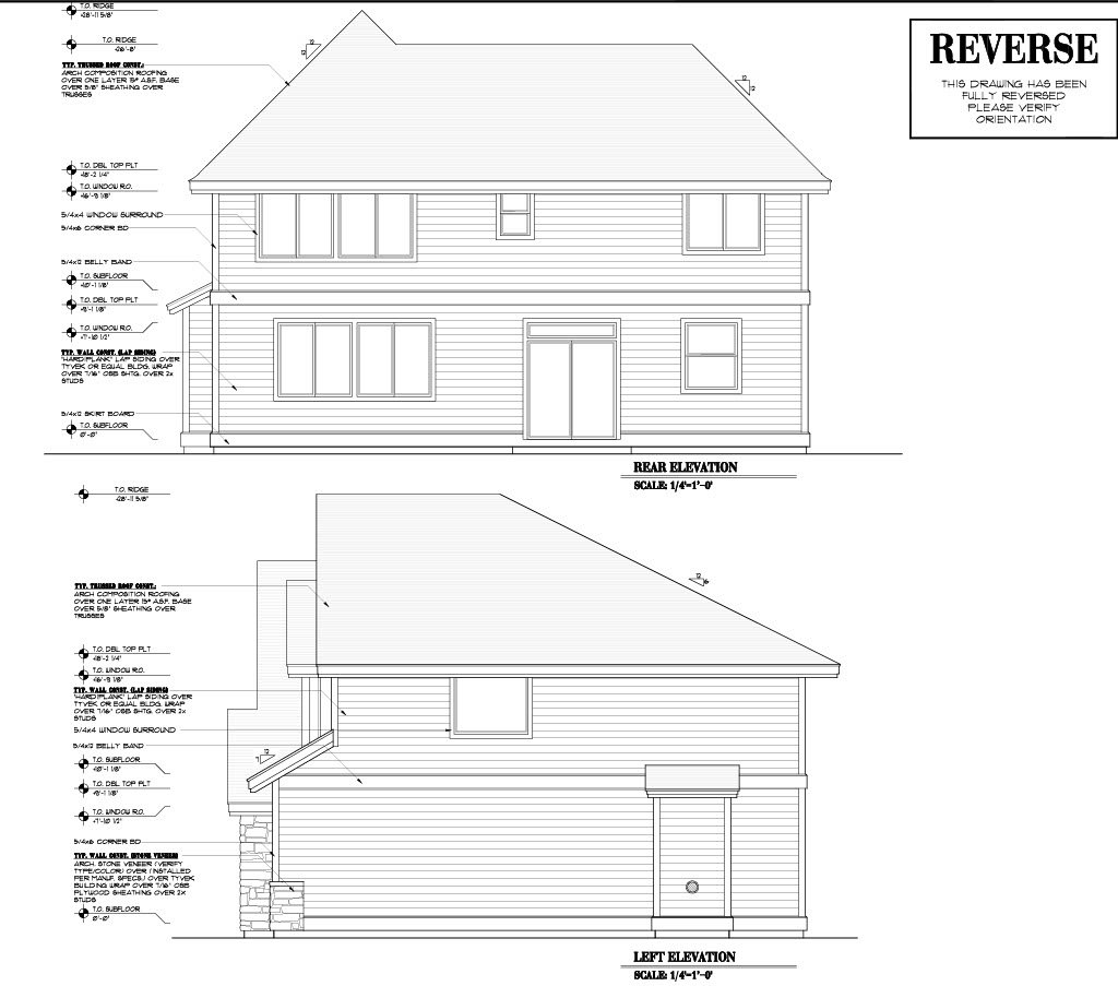- Exterior Elevations: A blueprint picture of all four sides showing exterior materials and measurements.