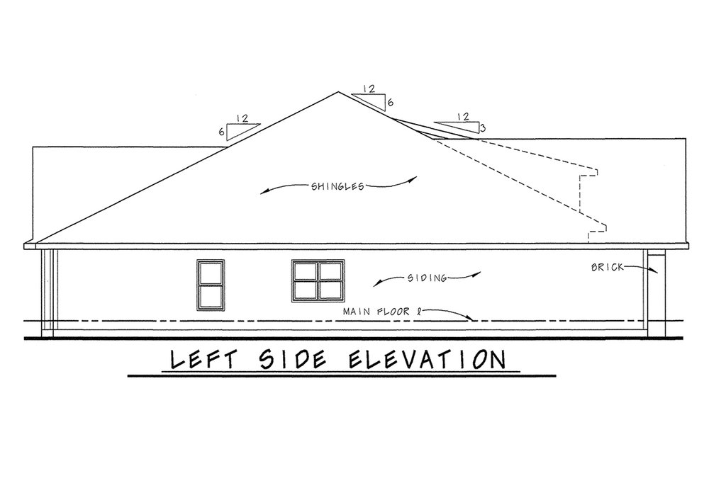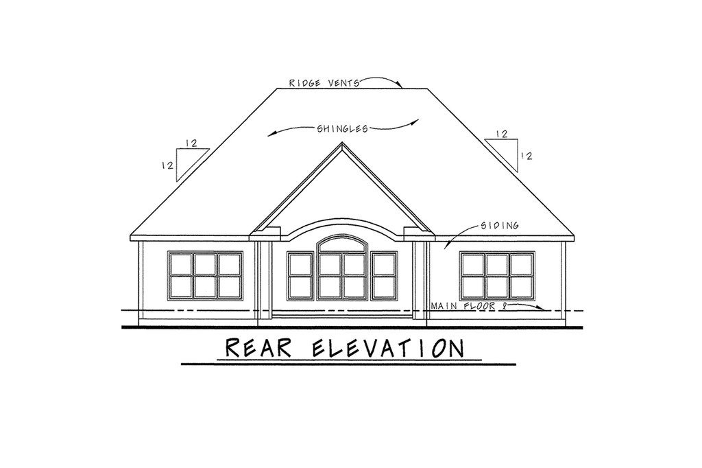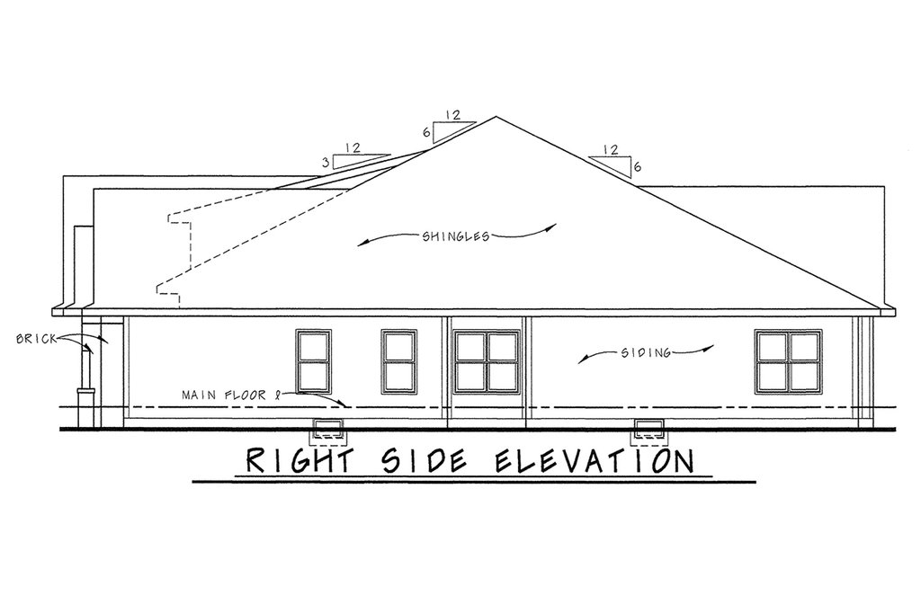 - Exterior Elevations: Drafted at 1/4" scale for the front and 1/8" scale for the rear and sides. All elevations are noted and an aerial view of the roof is provided, showing all hips, valleys and ridges.
