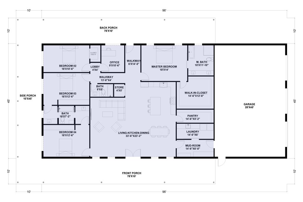 - Foundation Plan: This page shows all necessary notations and dimensions including support columns, walls, and excavated/unexcavated areas.