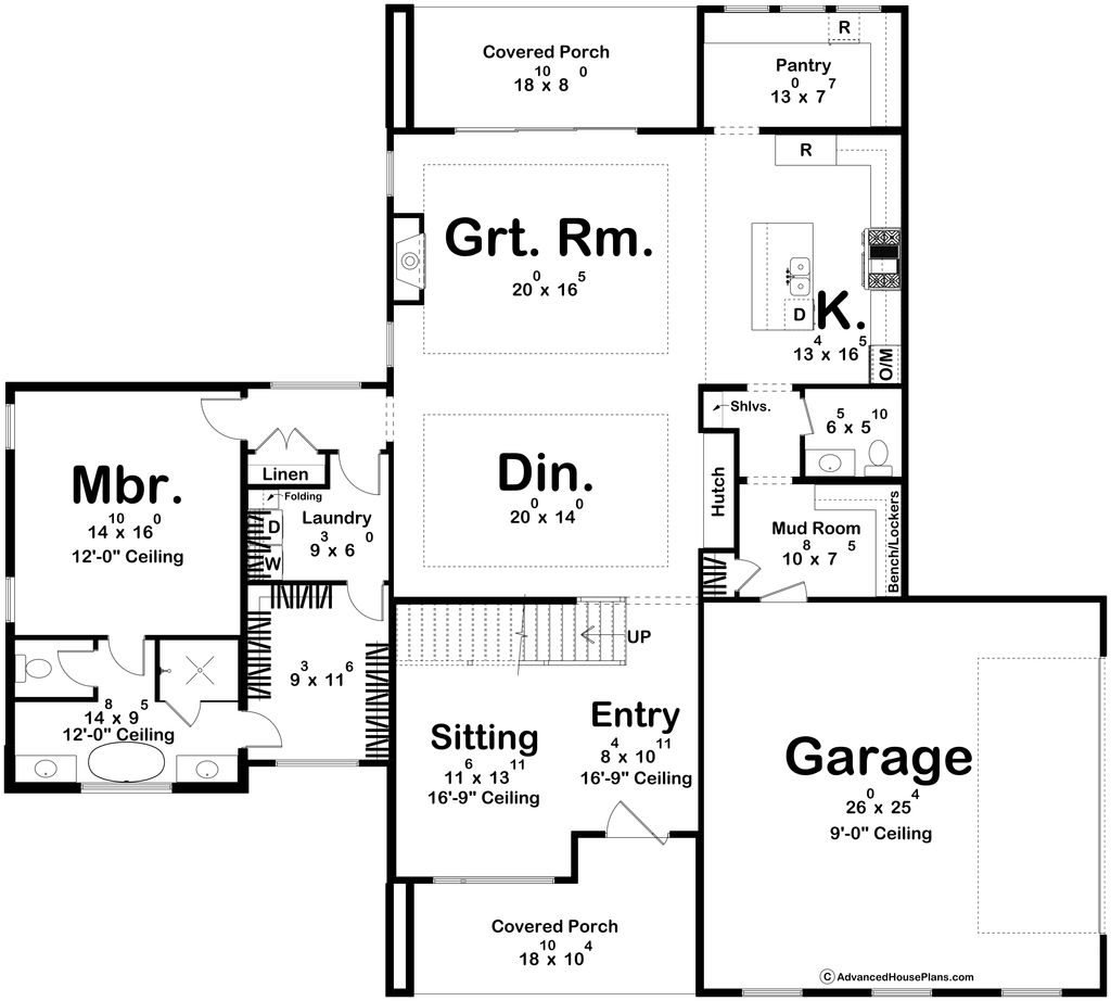Ceiling Details : The entryway and sitting room have a 2-story ceiling. The dining room and great room have tray ceilings. The master bedroom and master bathroom have 12'-0" ceilings.