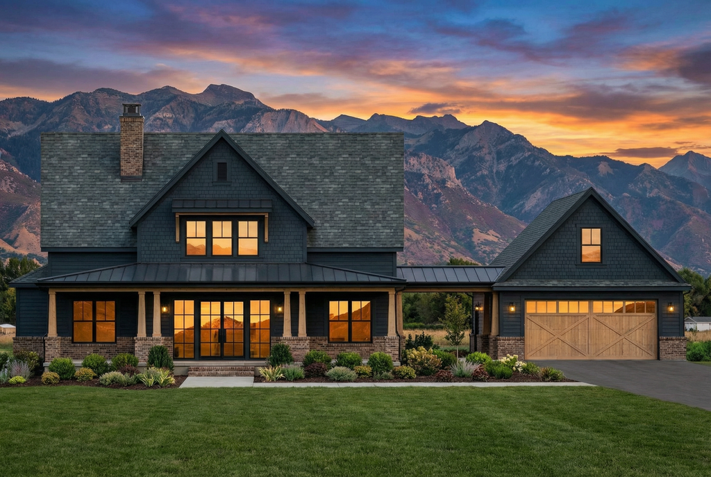 - Exterior Elevations: All elevations are noted, and an aerial view of the roof is provided, showing all hips, valleys, and ridges.