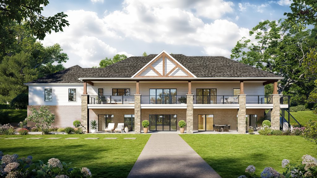 - Exterior Elevations: Views of the home from all four sides showing exterior materials, roof slope, ridge heights, siding and trim notes.