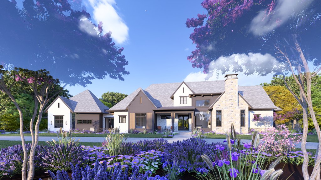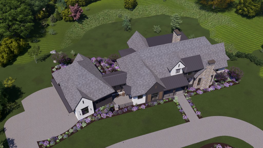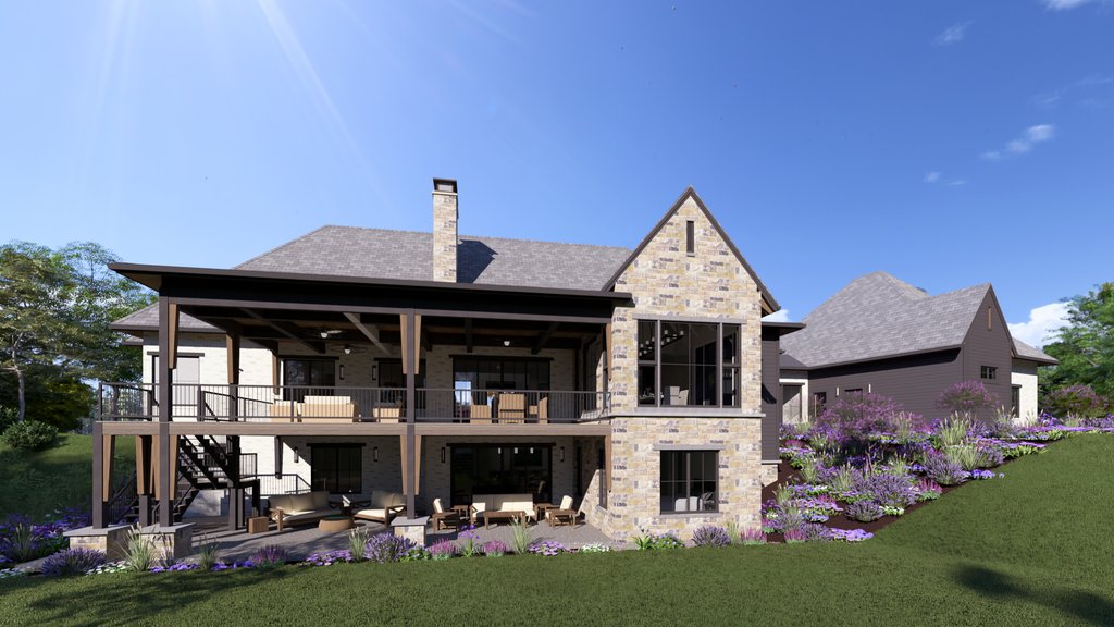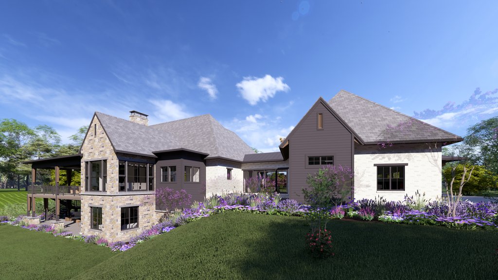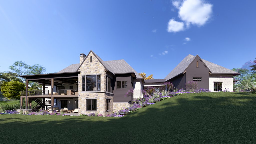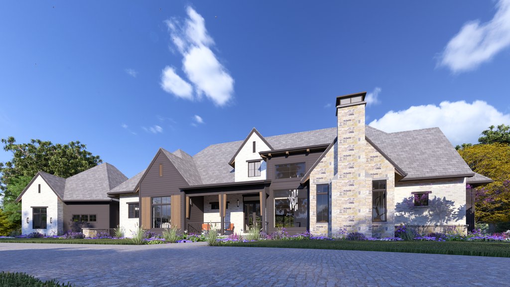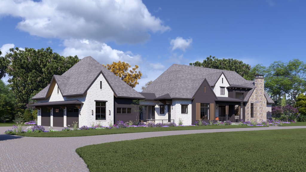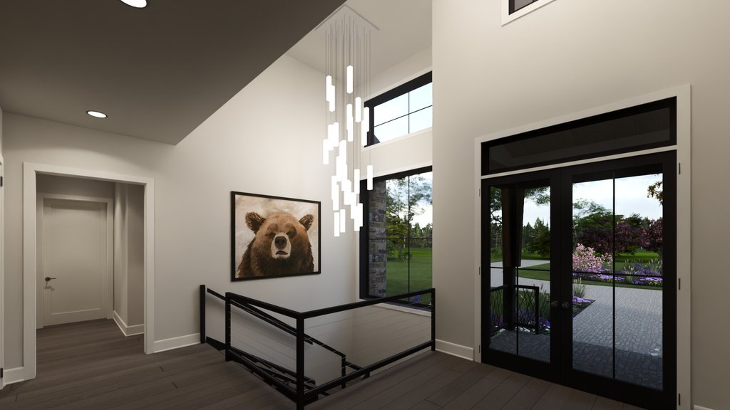 Modern Tudor exterior design with a mix of modern and traditional interiors. Large double owner bathrooms, spacious and open living room, dining room, kitchen arrangement. The entry foyer is a welcoming voluminous space with a grand stair to the basement.