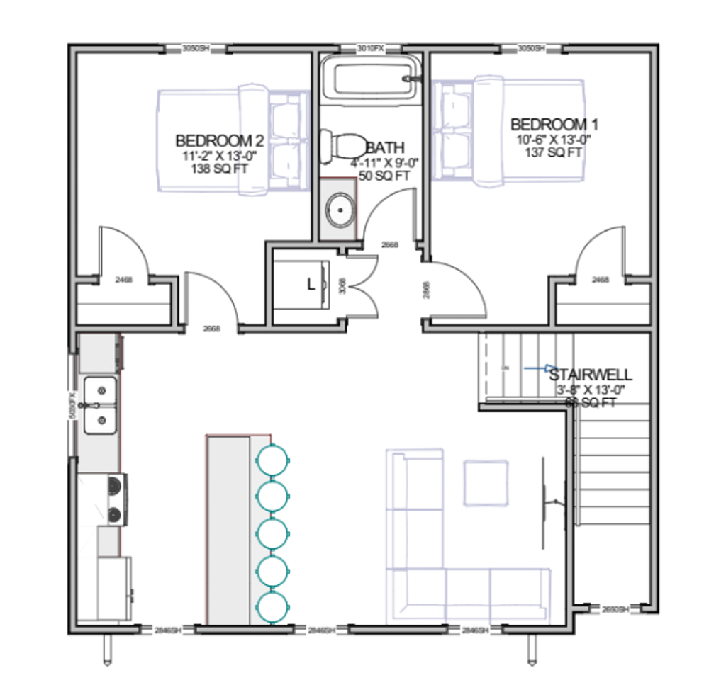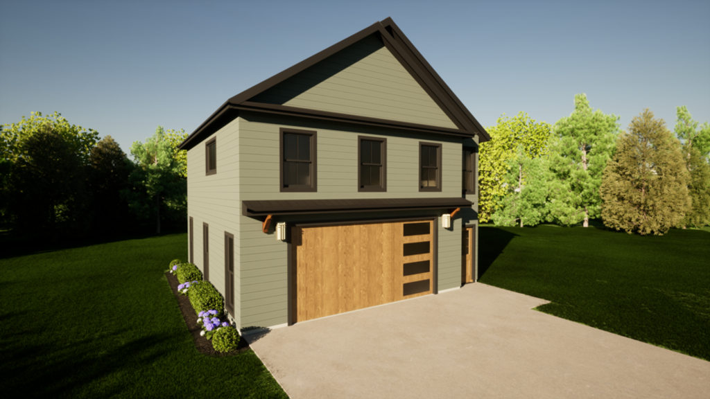 - A 16' wide and 8' tall garage door opens to the 642 square feet of parking on the ground level of this ADU or carriage house plan. A powder room is located in the back-right corner next to the dedicated utility closet. - A man door on the right also get you and has access to the garage or to the stairs that take you to the living level where wo bedrooms line the back wall and share a bath. - The front portion gives you a kitchen with island seating and a lounge area. -GIVING BACK: Please note the designer of this plan gives 10% of their profits on all sales to charities focused on helping children and families in foster care.